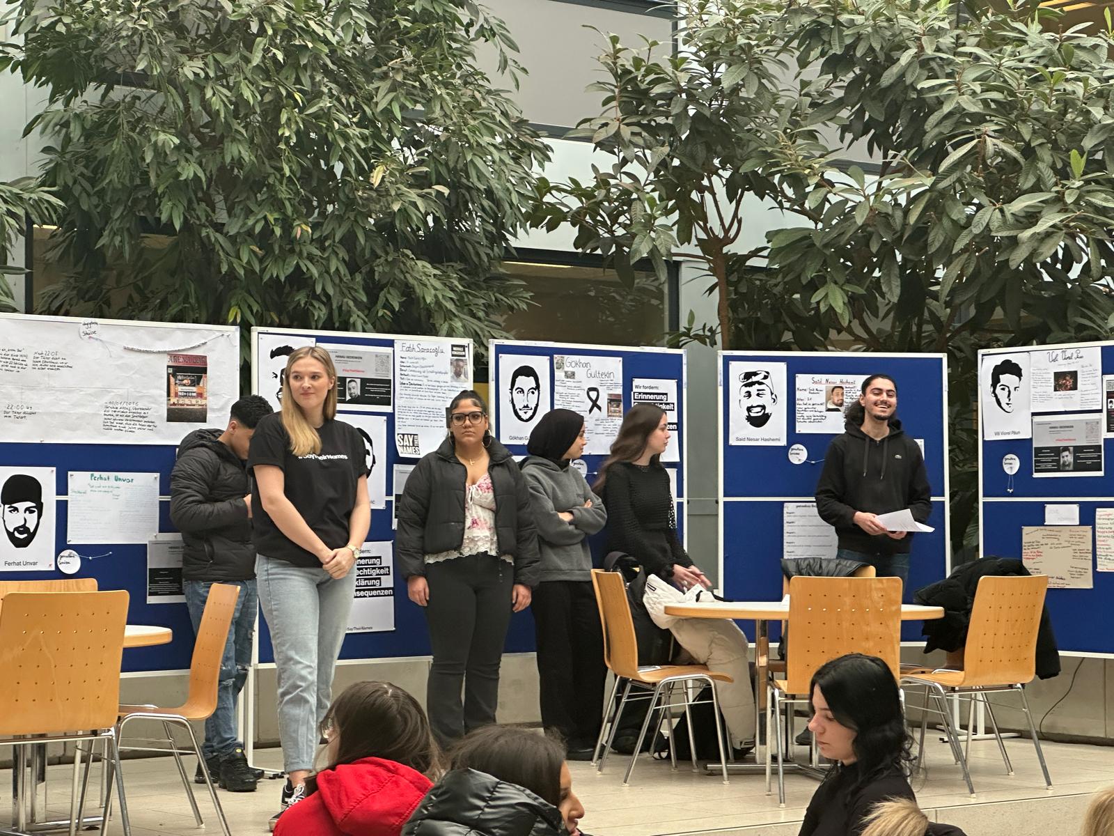 Ein besonders stiller und eindringlicher Moment fand in der zweiten großen Pause statt: Unter dem bundesweiten Motto #SayTheirNames versammelte sich die Schulgemeinschaft in der Mensa, um die Namen der neun Menschen zu verlesen, die vor sechs Jahren aus rassistischen Motiven aus dem Leben gerissen wurden.