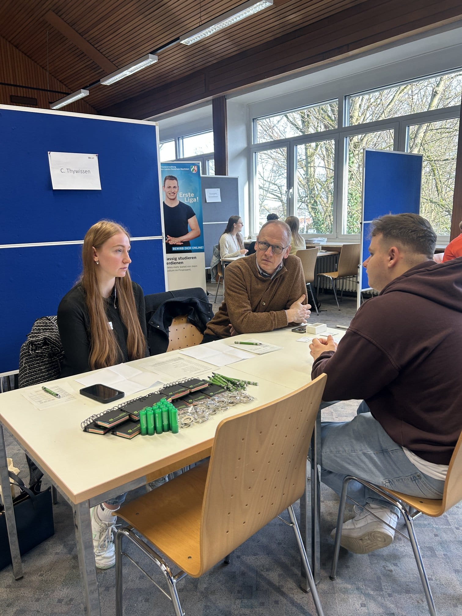 • Finanzen, Versicherung & Verwaltung: Das Finanzamt Grevenbroich, der Rhein-Kreis Neuss und die Sparkasse Neuss präsentierten kaufmännische Ausbildungen und duale Studiengänge (z. B. Bachelor of Laws oder Banking and Finance). Die Rheinland-Versicherungen suchten Nachwuchs für Versicherungen und Finanzanlagen.